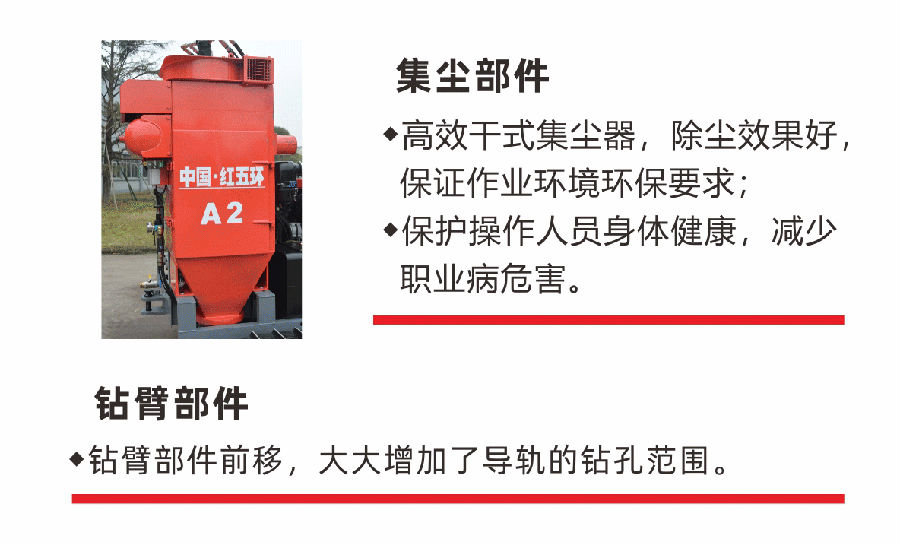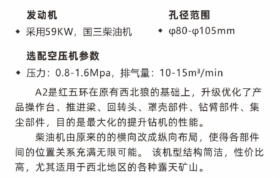 A2是紅五環(huán)在原有西北狼的基礎(chǔ)上,升級(jí)優(yōu)化了產(chǎn)品操作臺(tái)、推進(jìn)梁、回轉(zhuǎn)頭、罩殼部件、鉆臂部件、集塵部件,目的是最大化的提升鉆機(jī)的性能。柴油機(jī)由原來的的橫向改成縱向布局,使得各部件間的位置關(guān)系充滿無限可能。 該機(jī)型結(jié)構(gòu)簡(jiǎn)潔,性價(jià)比高,尤其適用于西北地區(qū)的各種露天礦山。