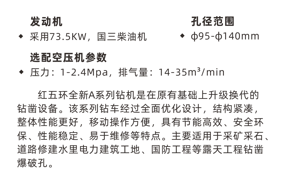 紅五環(huán)全新A系列鉆機是在原有基礎(chǔ)上升級換代的鉆鑿設(shè)備。該系列鉆車經(jīng)過全面優(yōu)化設(shè)計,結(jié)構(gòu)緊湊,整體性能更好,移動操作方便,具有節(jié)能高效、安全環(huán)保、性能穩(wěn)定、易于維修等特點。主要適用于采礦采石、道路修建水里電力建筑工地、國防工程等露天工程鉆鑿爆破孔。