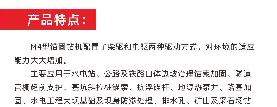 M4型錨固鉆機配置了柴驅(qū)和電驅(qū)兩種驅(qū)動方式,對環(huán)境的適應(yīng)能力大大增加。主要應(yīng)用于水電站、公路及鐵路山體邊坡治理錨索加固、隧道管棚超前支護、基坑斜拉樁錨索、抗浮錨桿、地源熱泵井、路基加固、水電工程大壩基礎(chǔ)及壩身防滲處理、排水孔、礦山及采石場鉆孔、微型樁孔等工程。