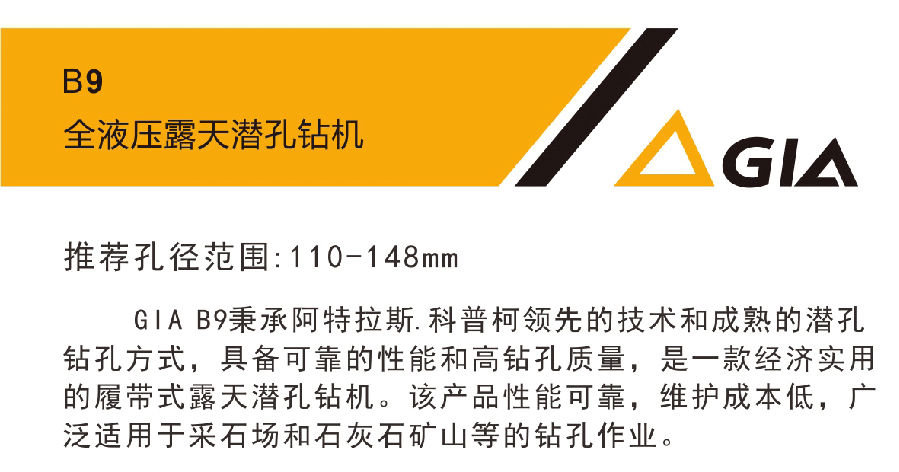推薦孔徑范圍:110-148mmGIA B9秉承阿特拉斯.科普柯領先的技術和成熟的潛孔鉆孔方式,具備可靠的性能和高鉆孔質量,是一款經濟實用的履帶式露天潛孔鉆機。該產品性能可靠,維護成本低,廣泛適用于采石場和石灰石礦山等的鉆孔作業(yè)。