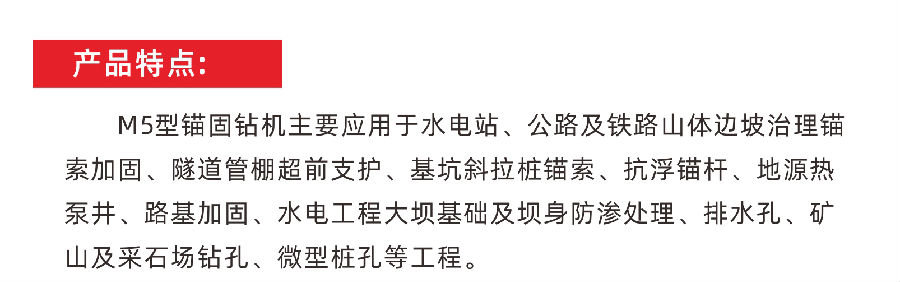 M5錨固鉆車(chē)主要應(yīng)用于水電站、公路及鐵路山體邊坡治理錨索加固、隧道管棚超前支護(hù)、基坑斜拉樁錨索、抗浮錨桿、地源熱泵井、路基加固、水電工程大壩基礎(chǔ)及壩身防滲處理、排水孔、礦山及采石場(chǎng)鉆孔、微型樁孔等工程。